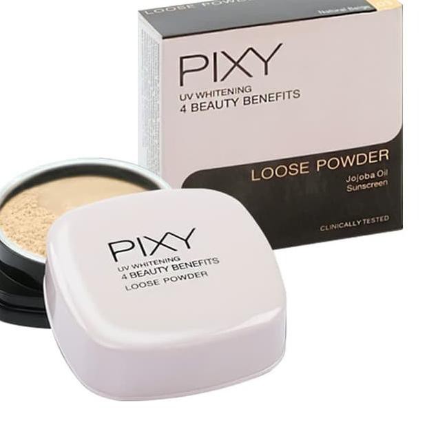 Pixy uv whitening loose powder hadir dengan 3 shade yakni ivory yellow beige dan natural beige. Bedak tabur pixy make it glow loose powder adalah bedak tabur dengan teksturnya yang lembut dan ringan serta menyerap kelebihan minyak pada wajah. Begitu pula dari pemasaran harga bedak pixy efek dan dampak pemakaian seri bedak pixy ini yang bisa membantu menjadikan wajah kelihatan lebih cerah dan berseri bebas dari jerawat serta bisa melindungi wajah dari sinaran matahari dan mencegah kulit menjadi kering. Cek harga di lazada.