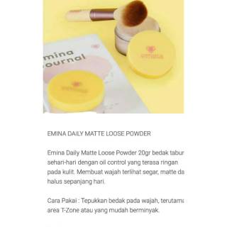 Kegunaan emina daily matte loose powder. Bagusss banget nelmpelnya di muka. Berbagai macam loose powder udah pernah aku coba mulai dari ultima wardah hingga viva. Jual emina loose powder daily matte 20gr bpom bedak tabur emina natural beige dengan harga rp27 999 dari toko online cenny store jakarta barat. Jual beli online aman dan nyaman hanya di tokopedia.